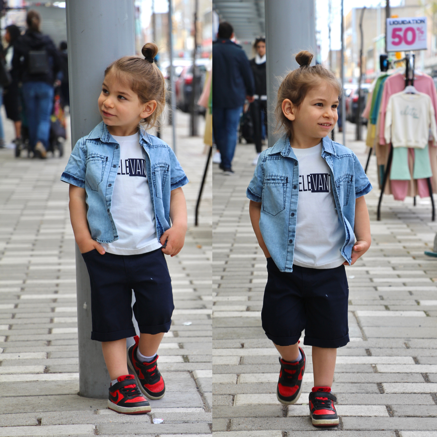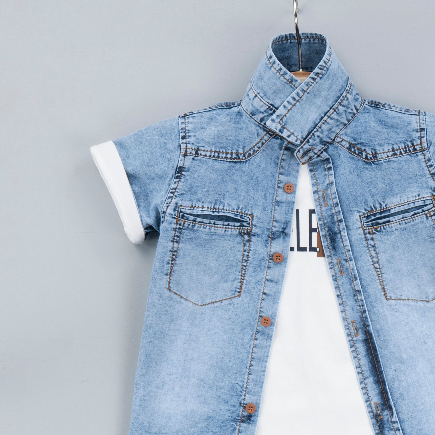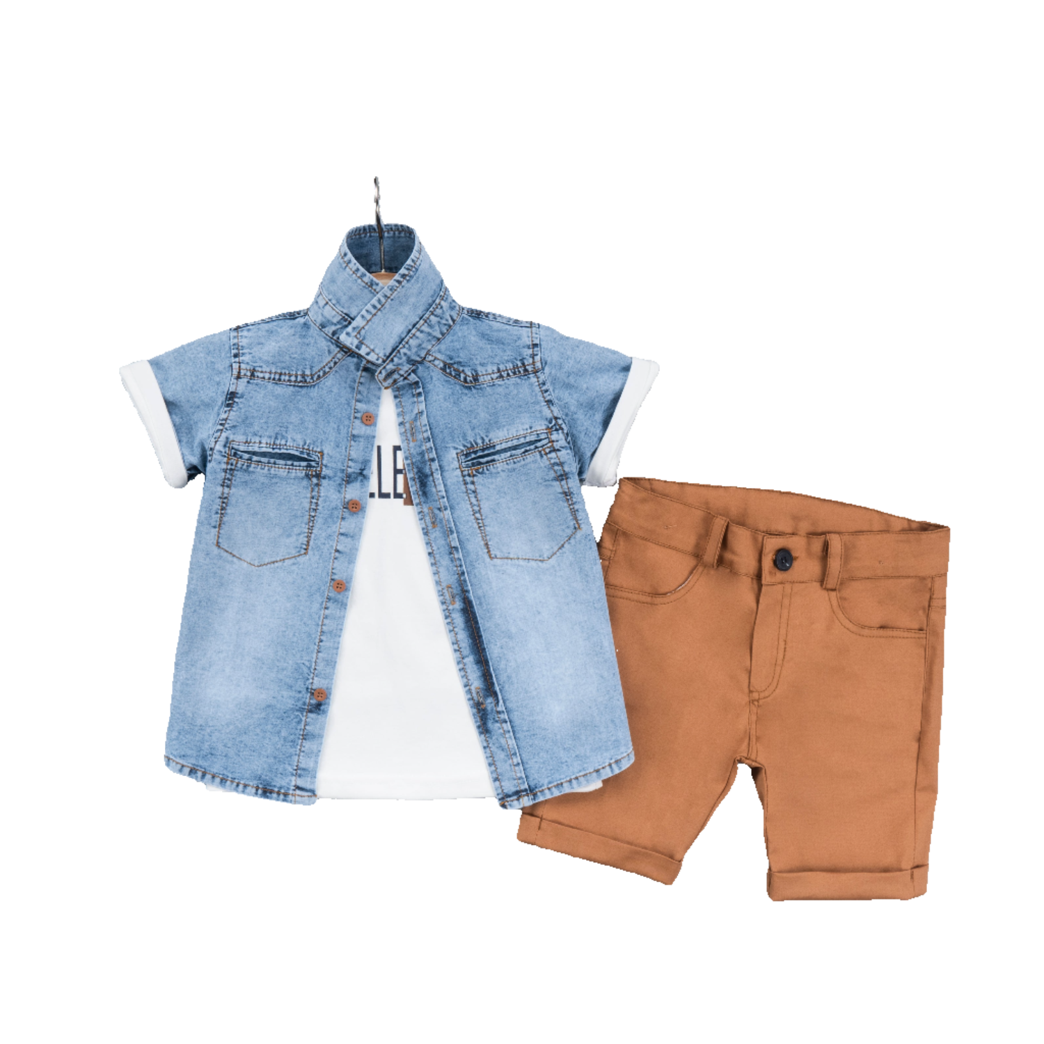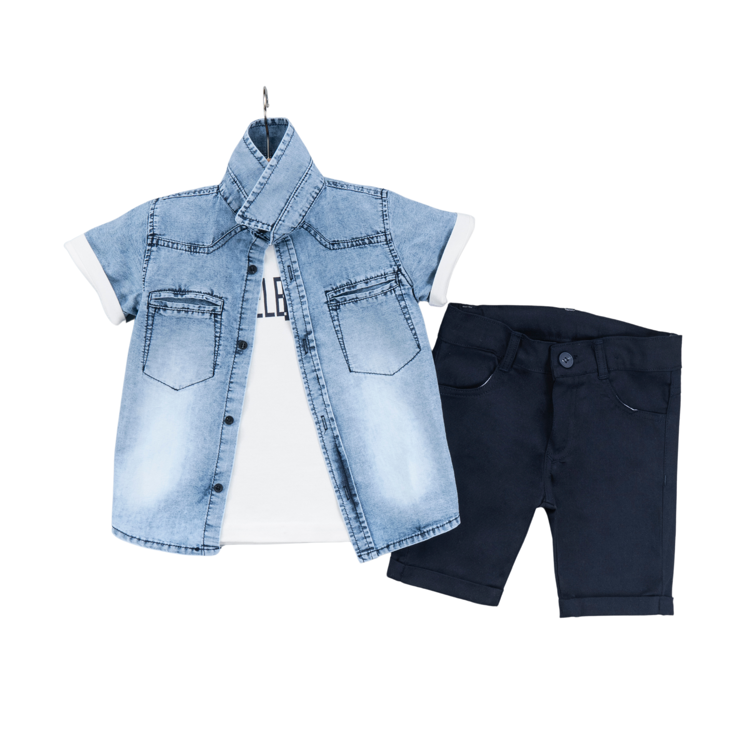 This trendy ensemble includes a comfortable denim shirt, a cool graphic T-shirt, and a pair of casual shorts. Perfect for playdates or family outings, this set combines fashion and comfort effortlessly.