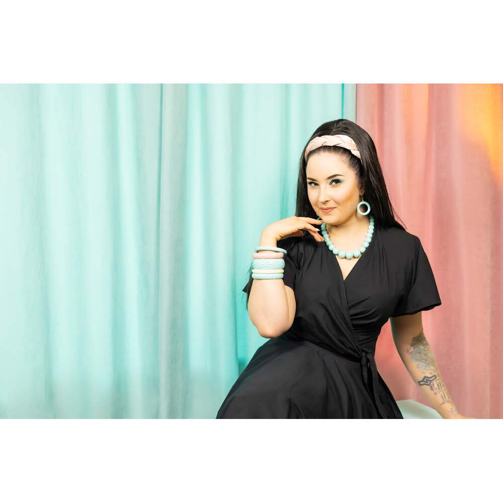 This bangle is a stylish addition to any look. It is made of pale blue resin and is carved with vintage detailing. It is available in three sizes and is perfect for a subtle yet eye-catching statement.