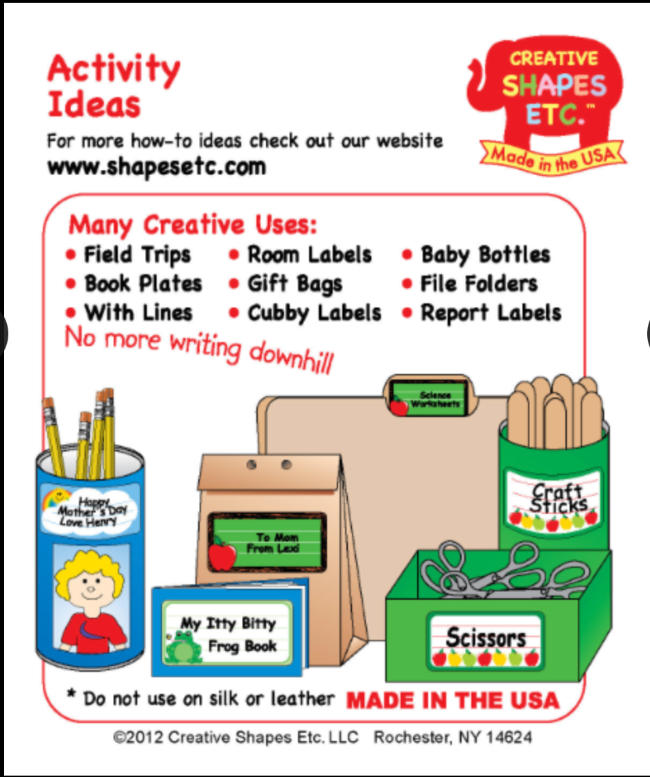 SHAPES ETC. Our Beach Nametags are self-adhesive and come 36 to a pack. Each nametag is 1 5/8" x 3 1/4" and they are lined, so no more writing downhill! They're great for field trips, desk tags, cubby markers, address labels and much more!